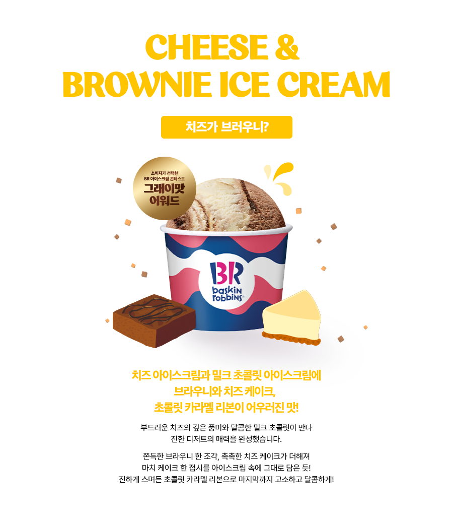치즈 아이스크림과 밀크 초콜릿 아이스크림에 브라우니와 치즈 케이크, 초콜릿 카라멜 리본이 어우러진 맛!