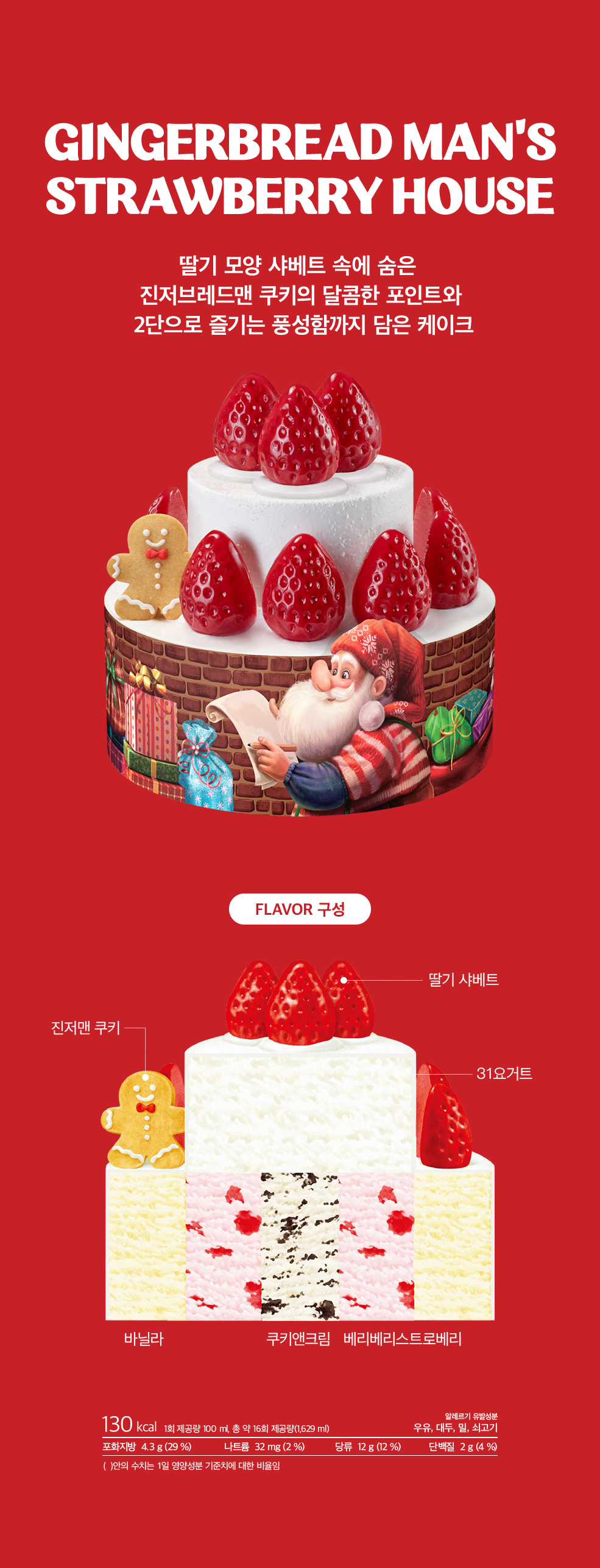 딸기 모양 샤베트 속에 숨은 진저브레드맨 쿠키의 달콤한 포인트와 2단으로 즐기는 풍성함까지 담은 케이크