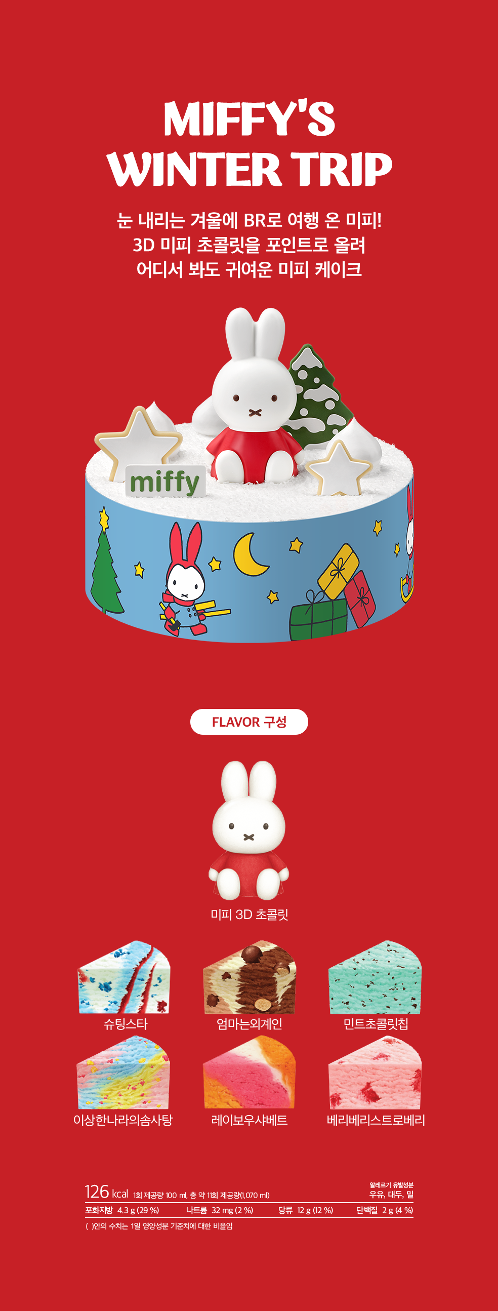 눈 내리는 겨울에 BR로 여행 온 미피! 3D 미피 초콜릿을 포인트로 올려 어디서 봐도 귀여운 미피 케이크