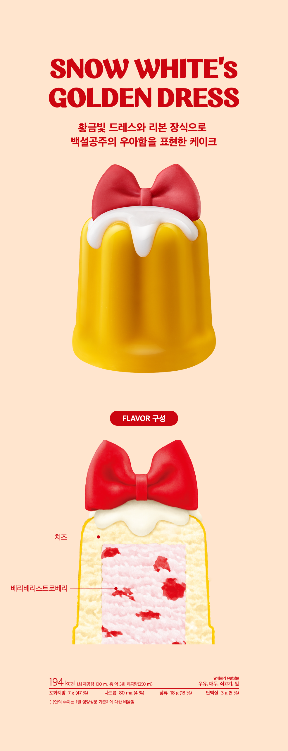 ICECREAM CAKE SNOW WHITE´s GOLDEN DRESS 백설공주의 황금 드레스 황금빛 드레스와 리본 장식으로 백설공주의 우아함을 표현한 케이크 11,000원 베리 베리 에그 마법에 걸린 달콤한 사과