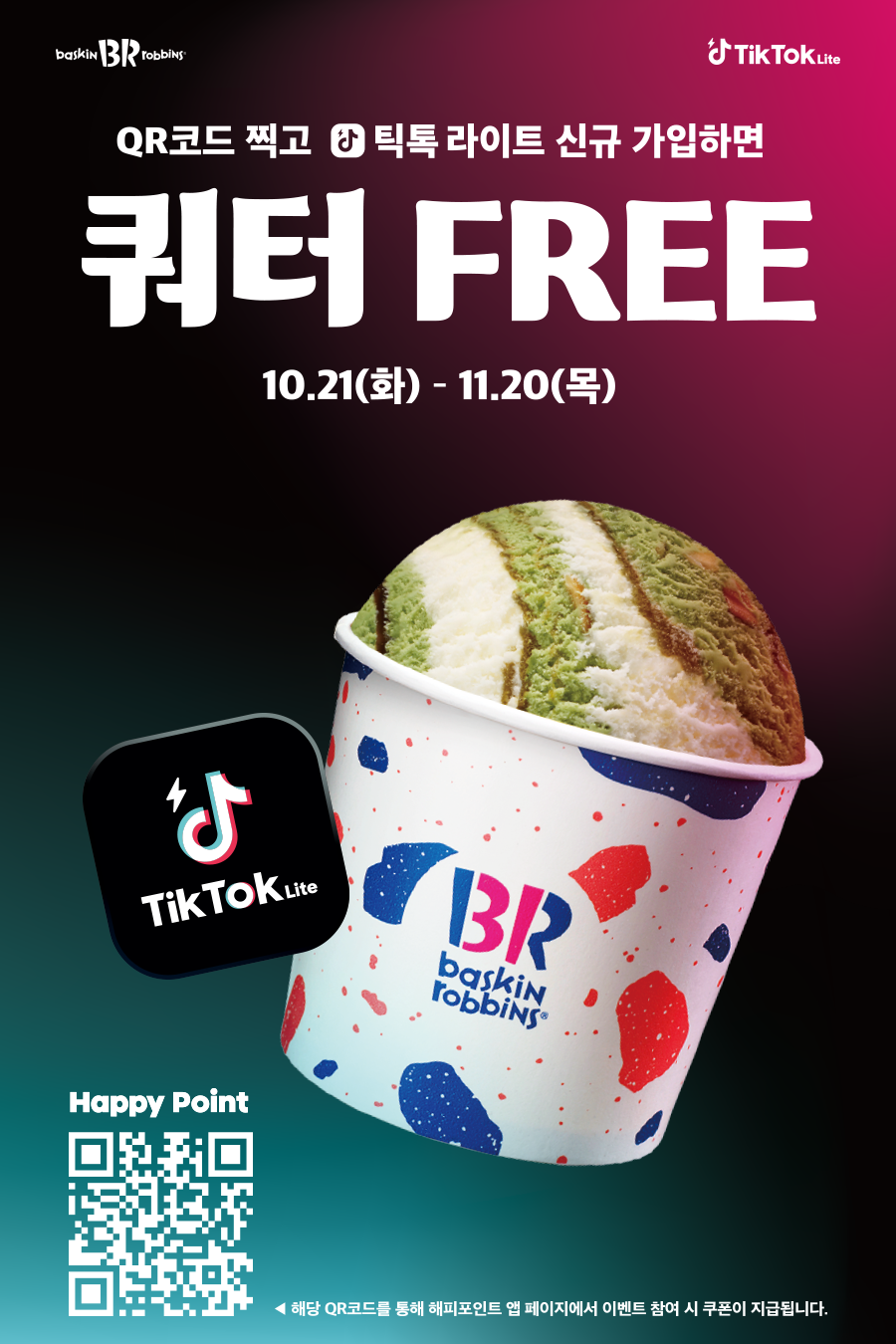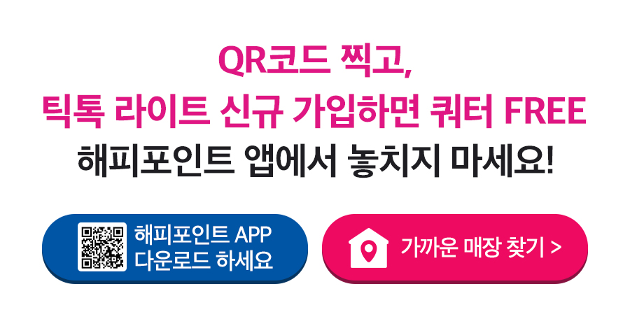 - 자세한 사항은 QR코드로 연결되는 해피포인트 앱 이벤트 페이지를 확인해주세요.