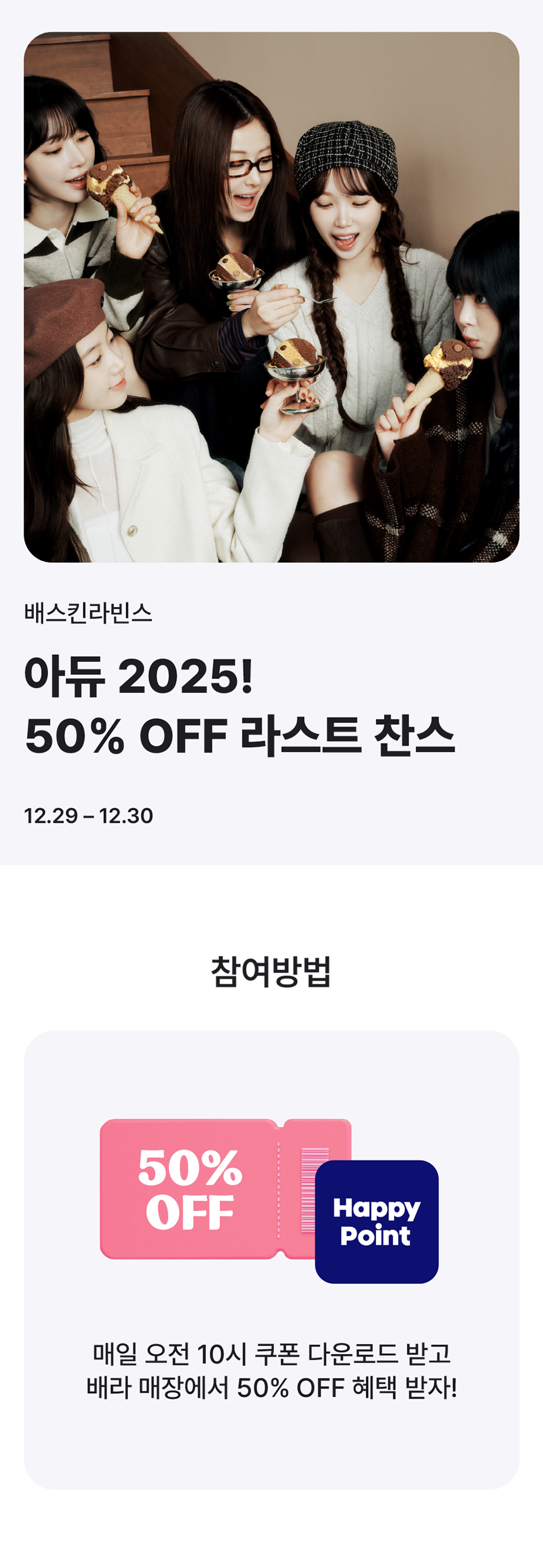 - 본 이벤트는 해피포인트 앱 이벤트 페이지에서 쿠폰 다운로드 후, 배스킨라빈스 매장 현장에서 제품 구매 시 쿠폰을 사용하여 혜택을 적용 받으실 수 있습니다.