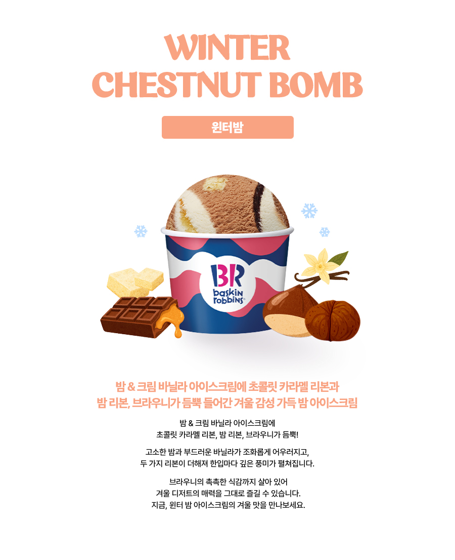밤 & 크림 바닐라 아이스크림에 초콜릿 카라멜 리본과 밤 리본, 브라우니가 듬뿍 들어간 겨울 감성 가득 밤 아이스크림