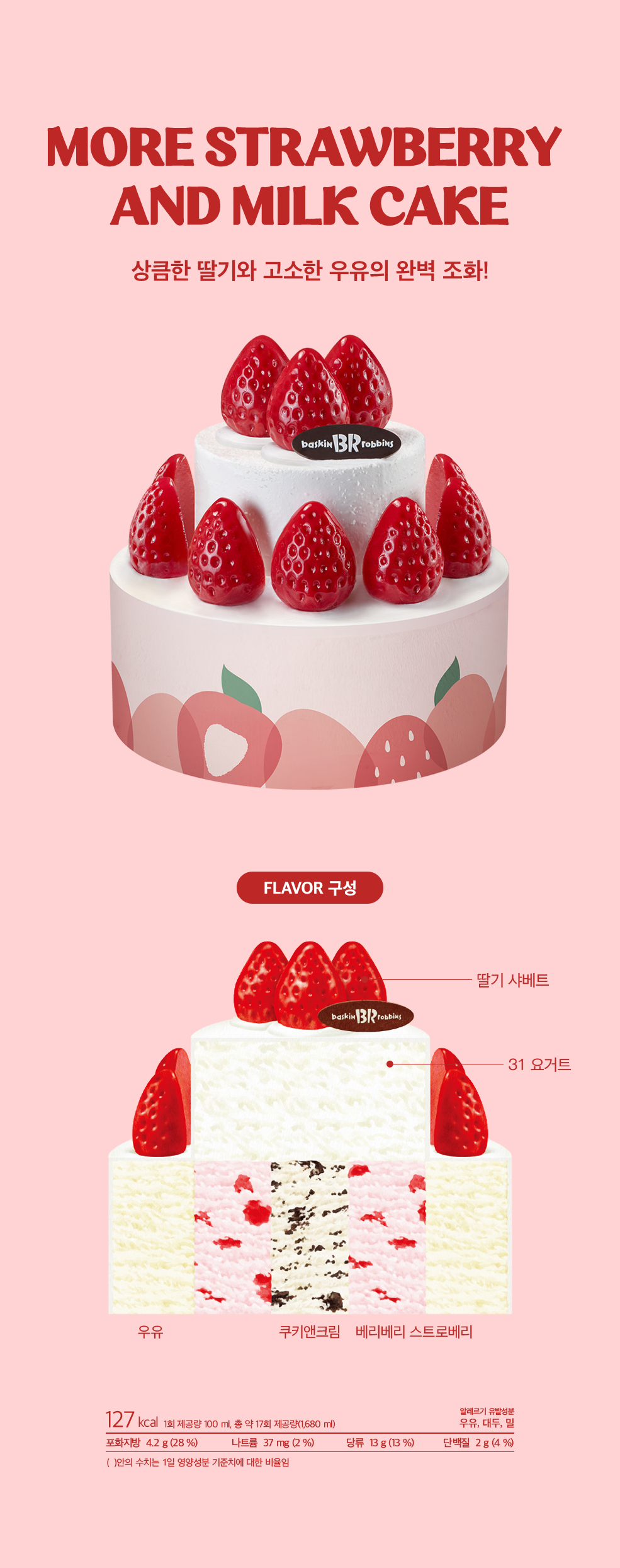 달콤상큼한 딸기 샤베트와 고소한 우유 풍미가 가득! 2단으로 더 풍성해진 더 듬뿍 딸기 우유 케이크!