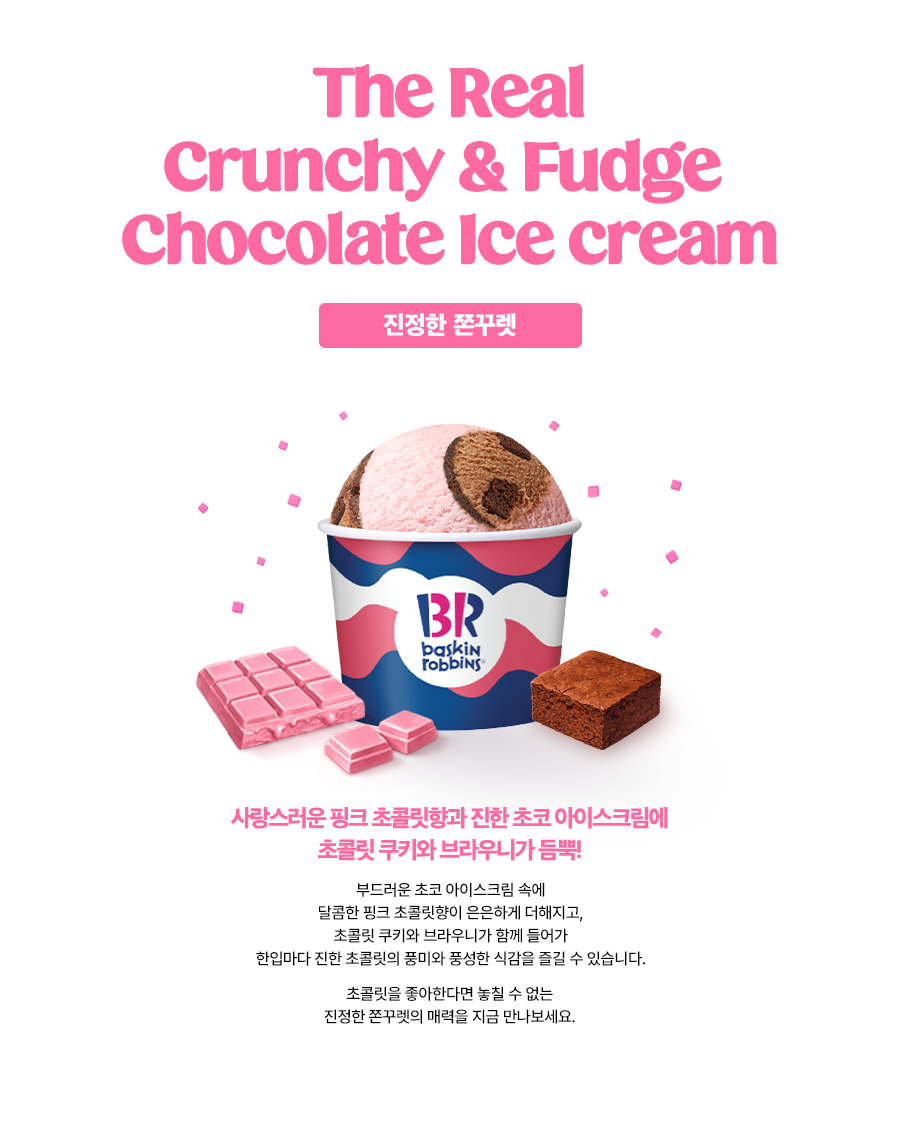 바삭, 쫀득, 꾸덕한 초콜렛 아이스크림! 사랑스러운 핑크 초콜릿 향& 초콜릿 아이스크림에 초콜릿 쿠키와 브라우니가 가득