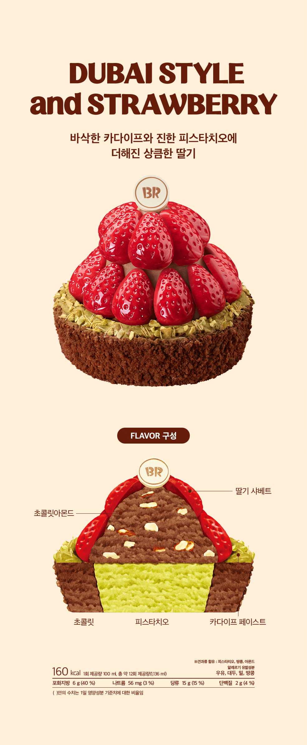 ICECREAM CAKE DUBAI STYLE and STRAWBERRY 두바이 스타일 앤 스트로베리 바삭한 카다이프와 진한 피스타치오에 더해진 상큼한 딸기 42,000원 스트로베리 요거트 프레지에 럭키 포니 춘식이