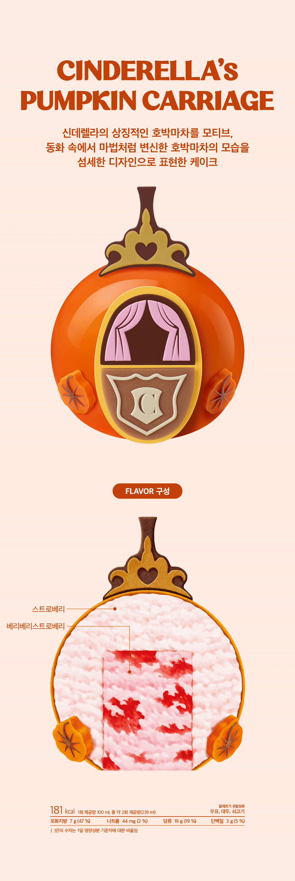 신데렐라의 상징적인 호박마차를 모티브, 동화 속에서 마법처럼 변신한 호박마차의 모습을 섬세한 디자인으로 표현한 케이크