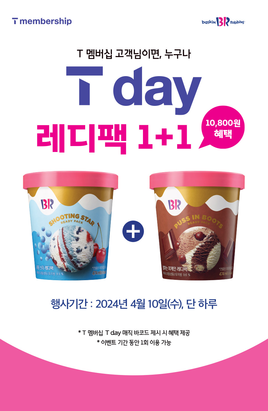 · T day 혜택은 T 멤버십 상시 할인/적립 혜택과 같은 날에 이용하실 수 있습니다. 단, 결제 1건당 1개의 혜택만 받으실 수 있습니다.