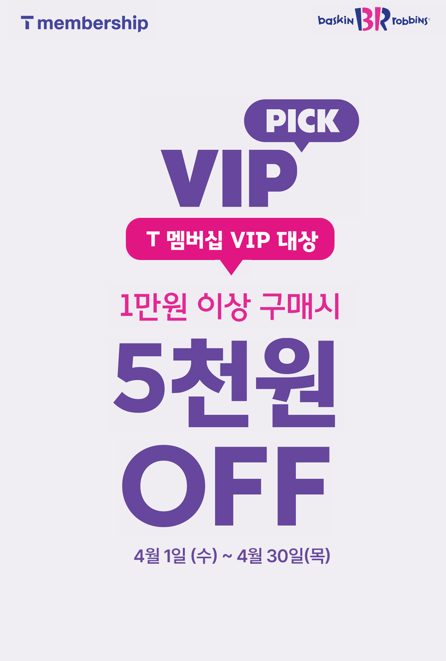 - T멤버십 APP > VIP PICK 혜택 > 배스킨라빈스 선택 > 쿠폰 다운로드 후 [혜택 쿠폰함]에서 확인 가능
